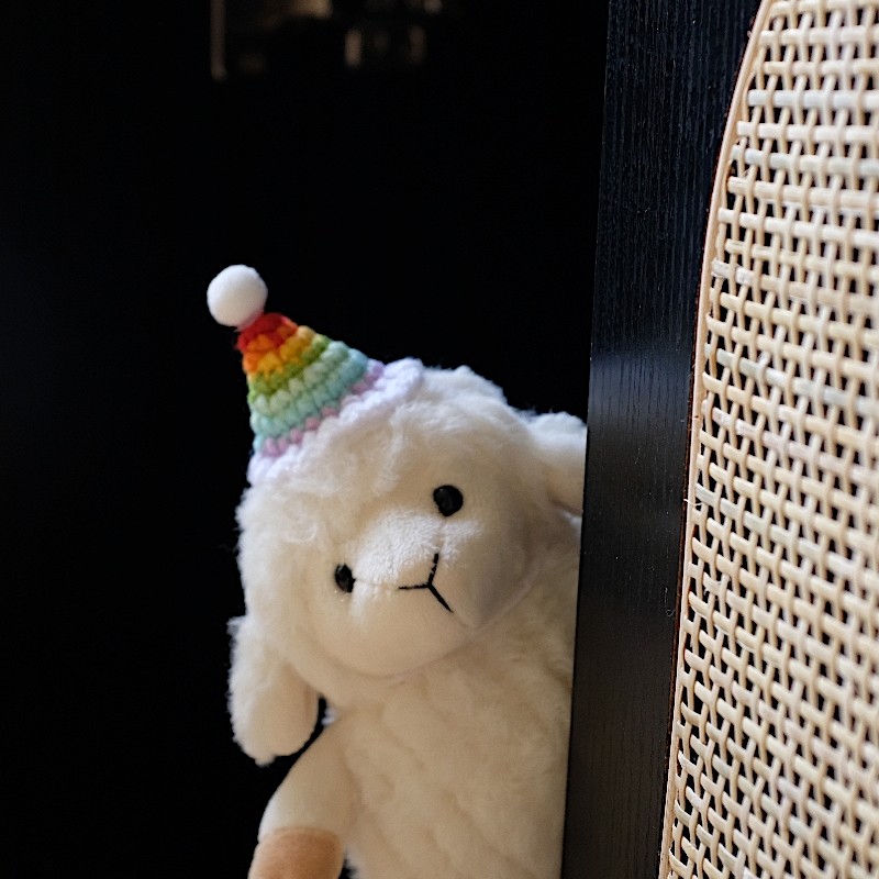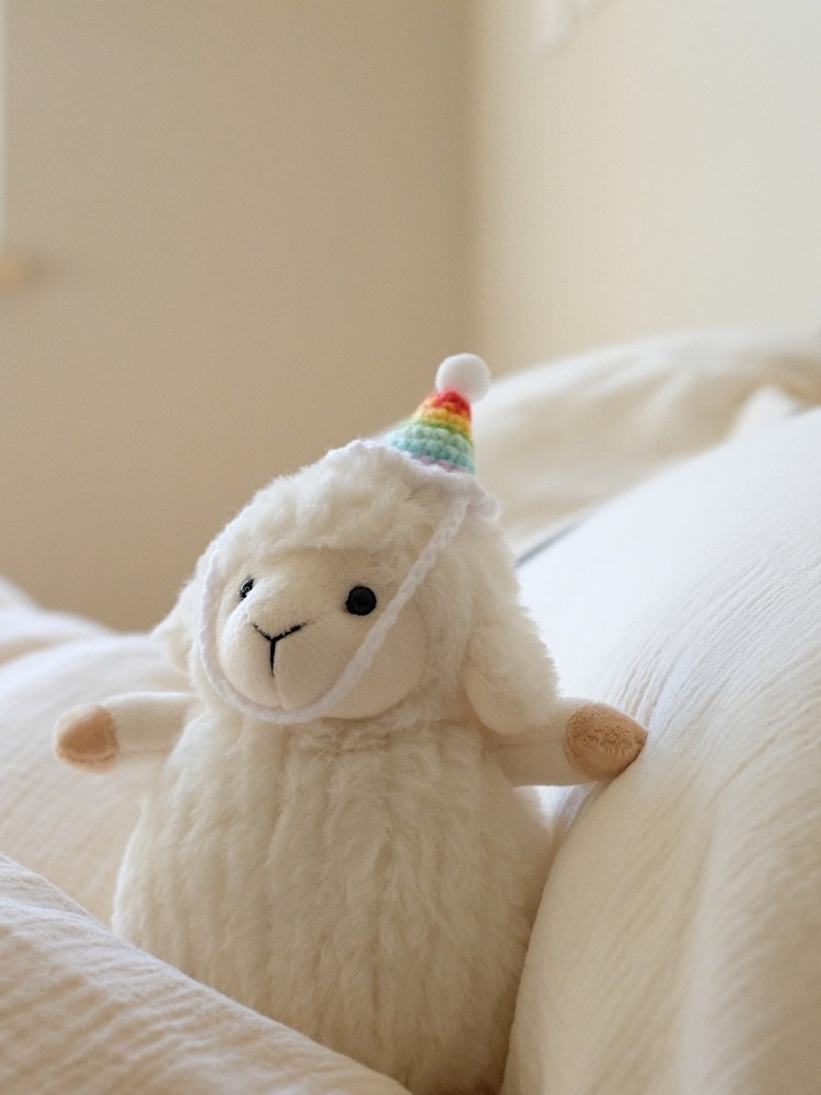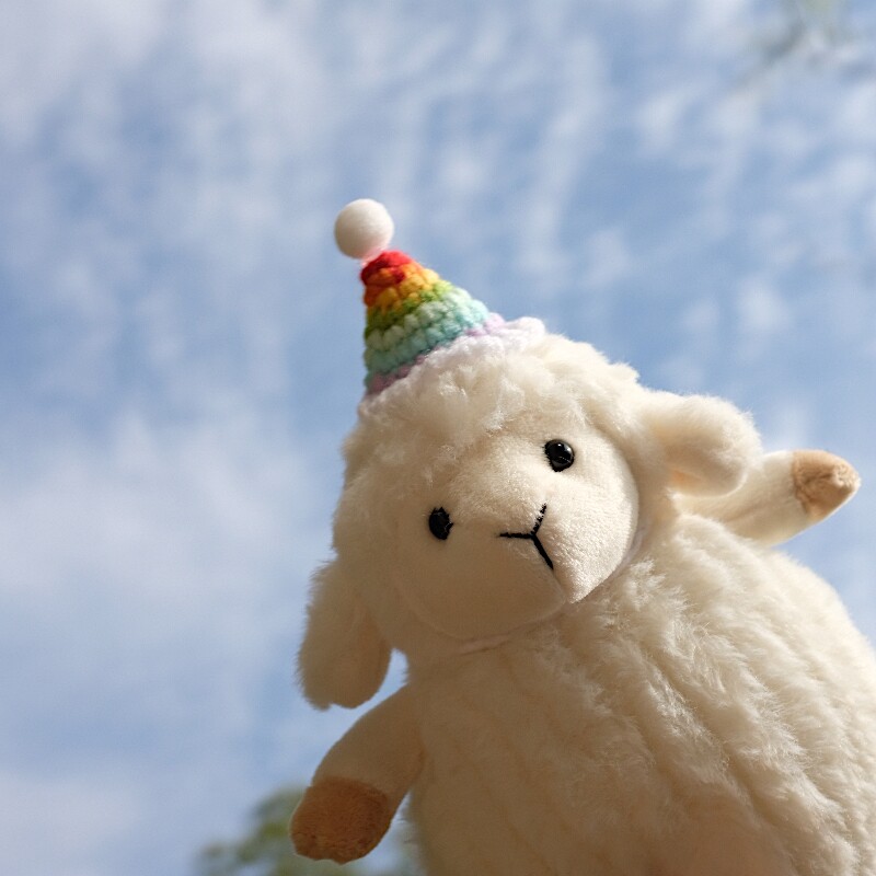- Handmade rainbow hat: Each hat is crocheted by hand, making every sheep unique. Minor variations in color and stitching are part of its charm.